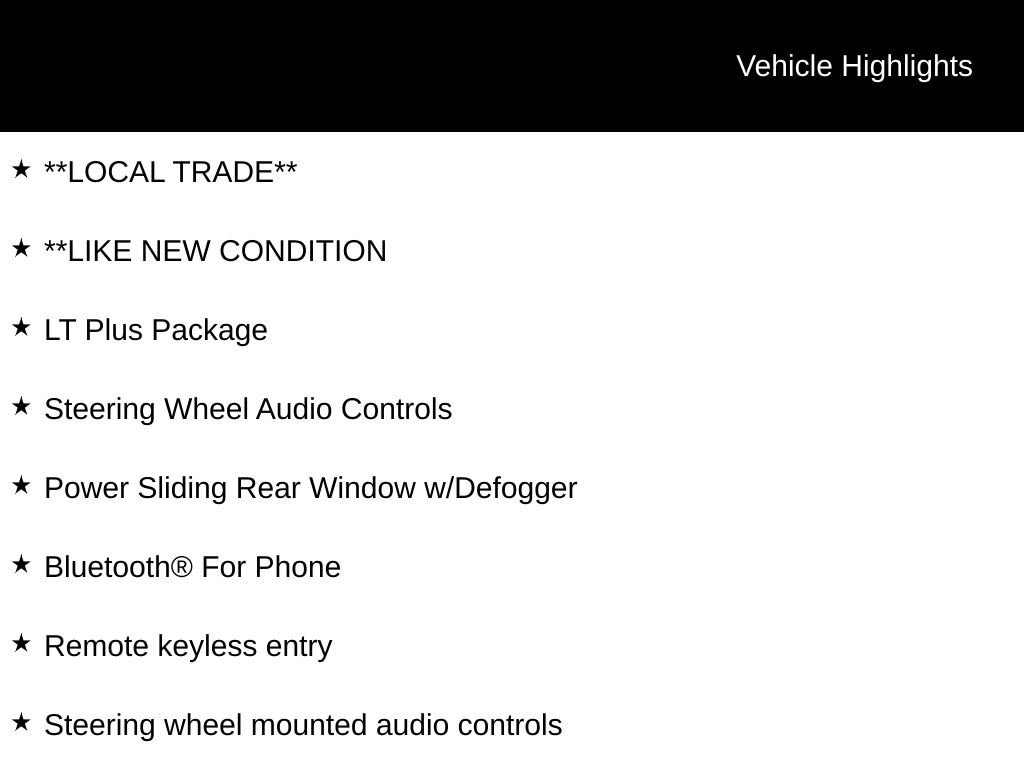 **LOCAL TRADE**, **LIKE NEW CONDITION, Alloy wheels, Bluetooth® For Phone, EZ Lift & Lower Tailgate, Heavy-Duty Rear Locking Differential, LT Plus Package, Power Adjustable Pedals, Power Sliding Rear Window w/Defogger, Remote keyless entry, Steering Wheel Audio Controls, Steering wheel mounted audio controls, Ultrasonic Rear Park Assist, Universal Home Remote.