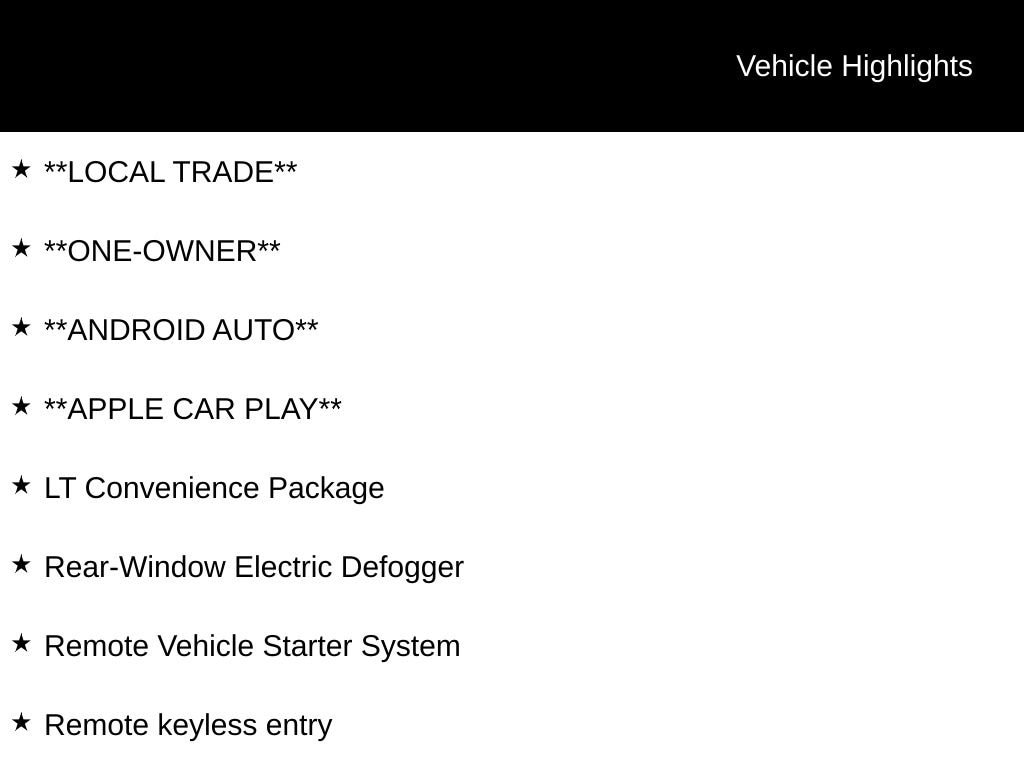 **LOCAL TRADE**, **ONE-OWNER**, **ANDROID AUTO**, **APPLE CAR PLAY**, Auto-dimming Rear-View mirror, Enhanced Driver Instrument Information Display, Front Fog Lamps, LT Convenience Package, Manual Rear-Sliding Window, Outside Heated Power-Adjustable Body-Color Mirrors, Power driver seat, Rear Vision Camera, Rear-Window Electric Defogger, Remote keyless entry, Remote Vehicle Starter System, Steering wheel mounted audio controls.