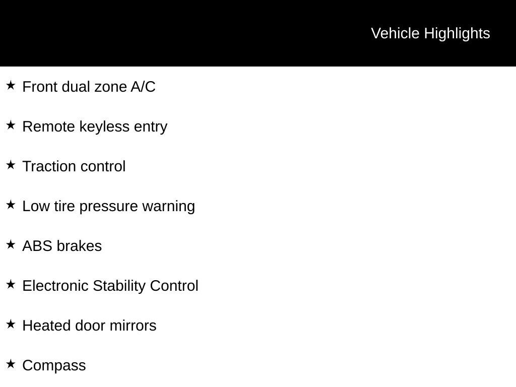 ABS brakes, Alloy wheels, Compass, Electronic Stability Control, Front dual zone A/C, Heated door mirrors, Heated front seats, Illuminated entry, Low tire pressure warning, Remote keyless entry, Traction control.