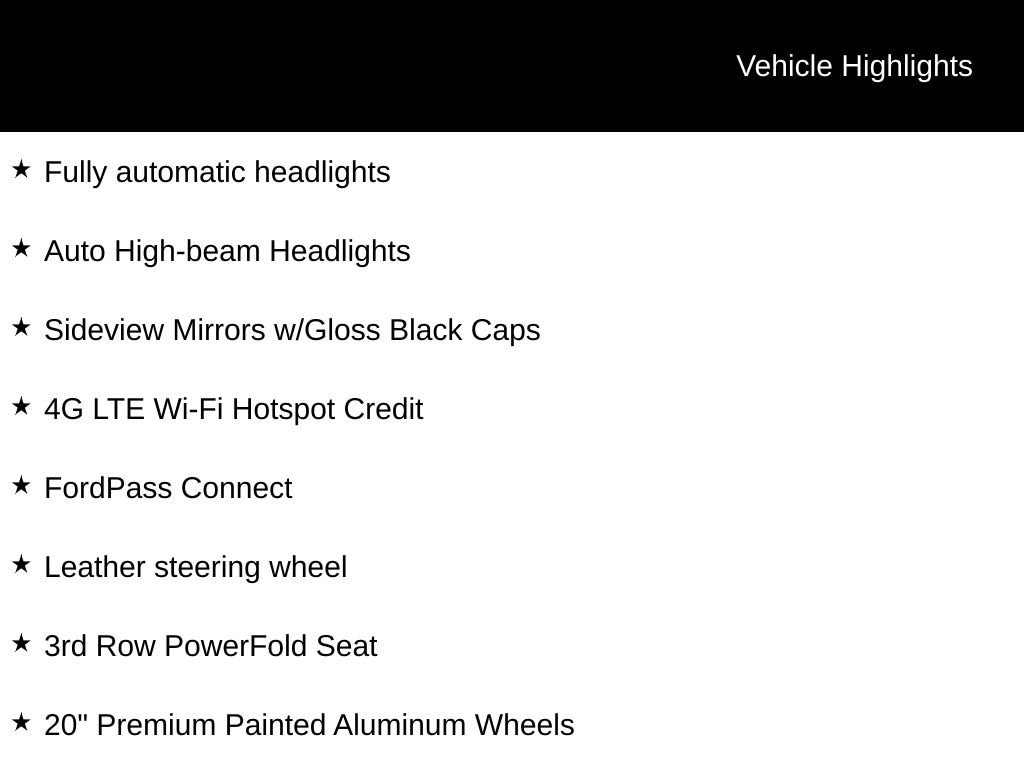 **ONE-OWNER**, **CERTIFIED CPO 100,000 WARRANTY**, **ANDROID AUTO**, **APPLE CAR PLAY**, **HEATED SEATS**, **HEATED STEERING WHEEL**, 110V/150W AC Power Outlet, 20 Premium Painted Aluminum Wheels, 3rd Row PowerFold Seat, 4G LTE Wi-Fi Hotspot Credit, Auto High-beam Headlights, Exterior Parking Camera Rear, FordPass Connect, Fully automatic headlights, Leather steering wheel, Limited Convenience Package, Memory Driver's Seat, Navigation System, Power Liftgate, Power Tilt/Telescoping Steering Column, Remote keyless entry, Sideview Mirrors w/Gloss Black Caps, Steering wheel mounted audio controls, SYNC 3 Communications & Entertainment System.