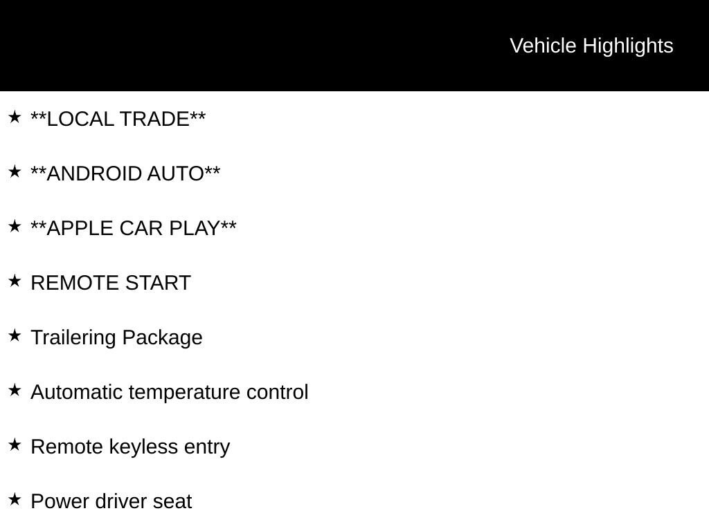 **LOCAL TRADE**, **ANDROID AUTO**, **APPLE CAR PLAY**, REMOTE START, Automatic Locking Rear Differential, Automatic temperature control, Exterior Parking Camera Rear, Fully automatic headlights, Hitch Guidance, Power driver seat, Remote keyless entry, Steering wheel mounted audio controls, Tow/Haul Mode, Trailering Package, Wheels: 18 x 8.5 Black Painted Aluminum.