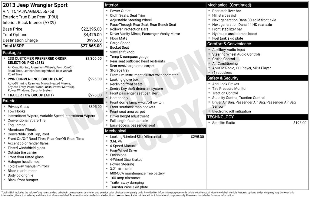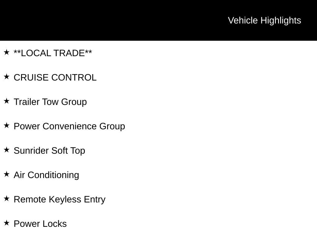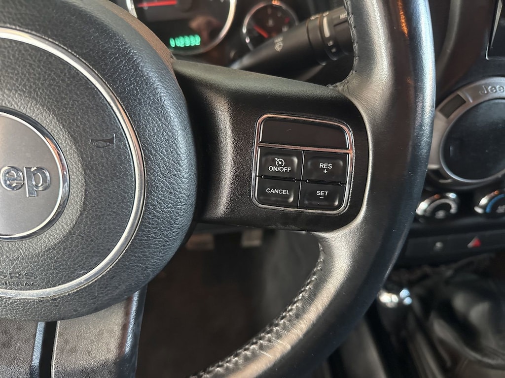 Beyond the impressive mechanical capabilities, this Wrangler offers a host of convenience features. Enjoy the comfort of air conditioning, the versatility of the Sunrider soft top, and the added security of the security alarm. Stay connected with the Uconnect 130 AM/FM/CD/MP3 radio and SiriusXM Satellite Radio. The leather-wrapped steering wheel and shift knob add a touch of refinement to the rugged Wrangler design.